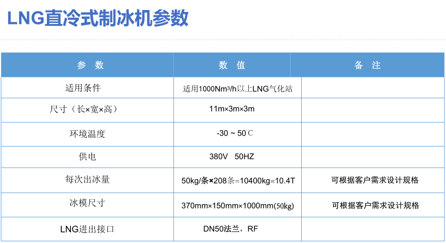 我公司最新研發(fā)生產(chǎn)的新型的LNG直冷式制冰機,可以將LNG中的冷能進行有效利用--制成冰塊,冰塊用于生產(chǎn)和日常生活中,變廢為寶,可獲得可觀的經(jīng)濟效益。