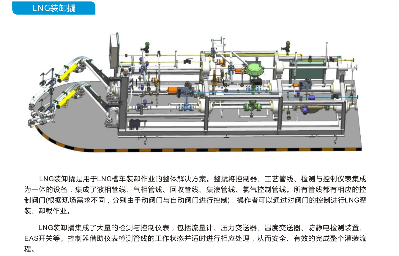 LNG裝卸撬是用于LNG槽車裝卸作業(yè)的整體解決方案。整撬將控制器、工藝管線、檢測與控制儀表集成為一體的設(shè)備,集成了液相管線、氣相管線、集液管線、放空管線、氮氣管線、儀表風(fēng)管線、取液管線、增壓管線。